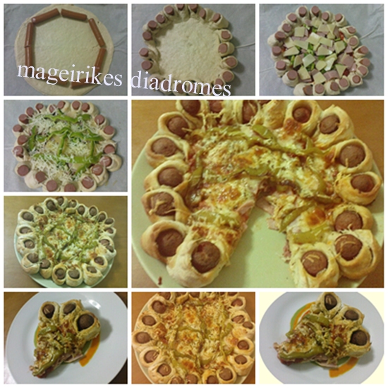 - Ανοίγουμε στρογγυλό φύλλο,βάζουμε γύρω γύρω τα λουκάνικα και γυρίζουμε τις άκρες προς τα μέσα.
