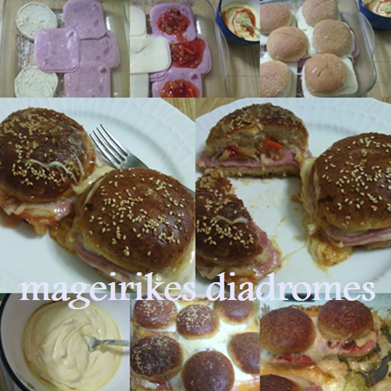 - Βουτυρώνουμε ελαφρά ένα πυρέξ, βάζουμε τα μισά ψωμάκια, απάνω βάζουμε τις μισές φέτες ζαμπόν και τυρί ,συνεχίζουμε πάλι με ζαμπόν τελειώνουμε με το τυρί. Τοποθετούμε απάνω τα υπόλοιπα μισά ψωμάκια κλείνοντας τη γέμιση.