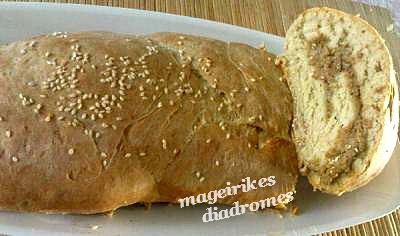 - Βάζουμε το ρολό μας σε λαδωμένο ταψί με την ένωση προς τα κάτω, αν θέλουμε πασπαλίζουμε με σουσάμι, σκεπάζουμε και αφήνουμε 30 λεπτά να φουσκώσει.