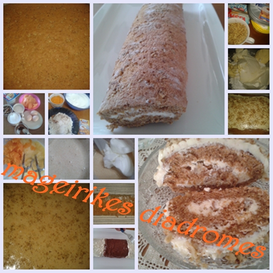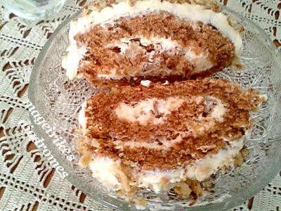- Ανοίγουμε το ρολό μας, βάζουμε γέμιση και πασπαλίζουμε με τα καρύδια. Τυλίγουμε πάλι σε ρολό, τώρα είναι πανεύκολο να τυλιχτεί, καλύπτουμε με το γλάσο που κρατήσαμε ή απλά πασπαλίζουμε με άχνη.