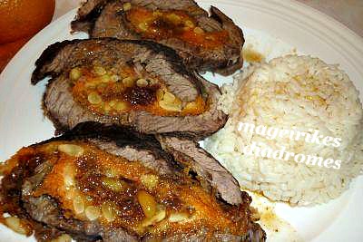 Ένα ρολό μοσχαρίσιο με καρότα ,κουκουνάρι , ρεγκάτο , σταφίδες και γλυκόξινη σάλτσα πορτοκαλιού!
