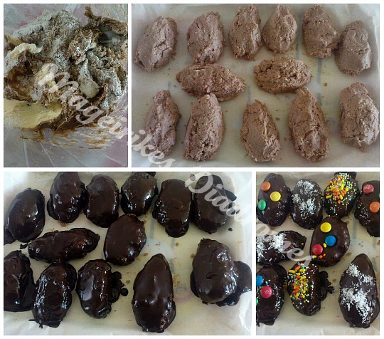 Βγάζουμε και πλάθουμε αυγουλάκια, εγώ χρησιμοποίησα ένα κουτάλι της σούπας, βάζουμε σε λαδόκολλα και αφήνουμε πάλι στο ψυγείο μέχρι να λιώσουμε την σοκολάτα.