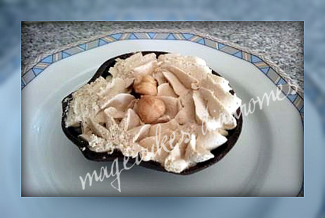 Βάζετε την κρέμα σε κορνέ και γεμίζετε το κοχύλι ( η όποιο άλλο σχέδιο επιλέξετε εσείς ) με ροζέτες