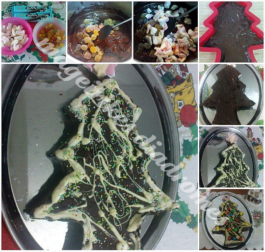 - Λιώνουμε 1/2 σοκολάτα λευκή σε μπεν μαρί και ρίχνουμε με ένα κουταλάκι πάνω στο δένδρο μας κάνοντας το περίγραμμα και ακανόνιστα σχέδια, πασπαλίζουμε με πολύχρωμη τρούφα και κολλάμε κουφετάκια.