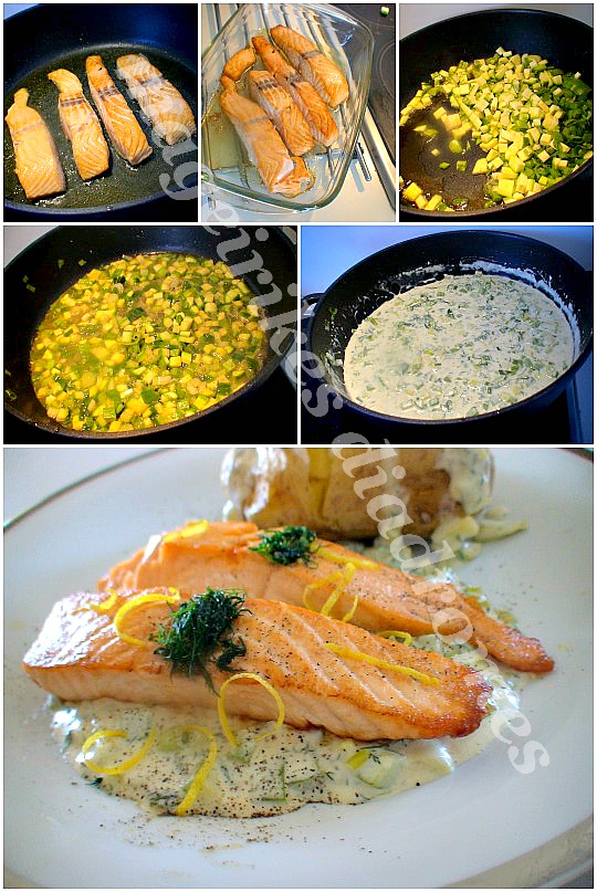- Στο τηγάνι που έβγαλα το ψάρι, φτιάχνω τη σάλτσα τυριού: σοτάρω τα κρεμμυδάκια και το κολοκύθι για 3-4 λεπτά και προσθέτω το τυρί κρέμα και μισή κούπα νερό (ίσως και περισσότερο), διαλύω καλά το τυρί ώστε να έχω μια κρέμα σχετικά αραιή. Προσθέτω αλάτι, πιπέρι, άνηθο και ξύσμα και βράζω για 2 λεπτά με μέτρια φωτιά.