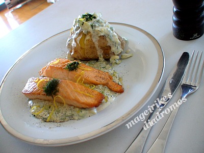 - Βγάζω το σολομό από το φούρνο και τον περιχύνω με τη σάλτσα τυριού.