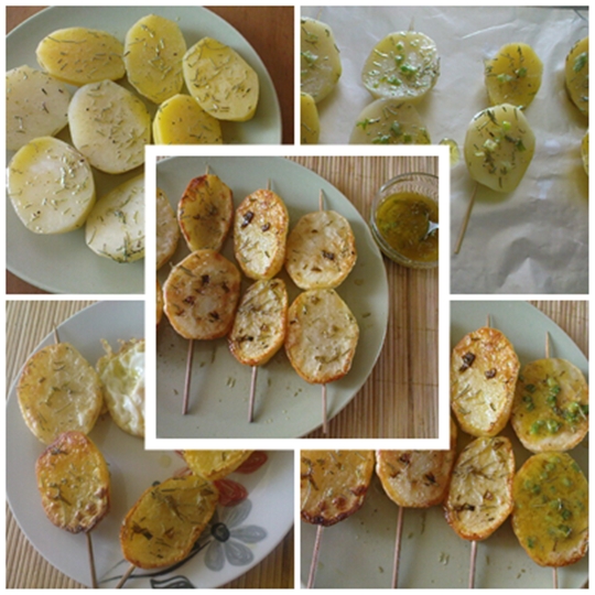 - Περνάμε τις πατάτες στα καλαμάκια, με την κομμένη πλευρά προς τα κάτω. Αλατοπιπερώνουμε και ψήνουμε τα σουβλάκια στη σχάρα για περίπου 15΄ γυρίζοντάς τα τακτικά, μέχρι να ροδίσουν καλά. Τα βάζουμε σε πιατέλα.