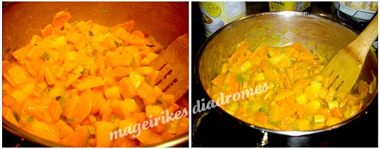 - Καθαρίζουμε και κοβουμε κοματακια την κολοκυθα,τα καροτα,την πατατα και το πρασο.