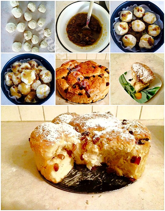 - Αφηνουμε σε ζεστό μέρος να διπλασιαστεί περίπου 30', μετα τα κόβουμε σε μικρά μπαλάκια σε μέγεθος μικρού αυγού . Ανακατεύουμε τη γέμιση ,βουτυρο , ζαχαρη , κ σταφίδες .