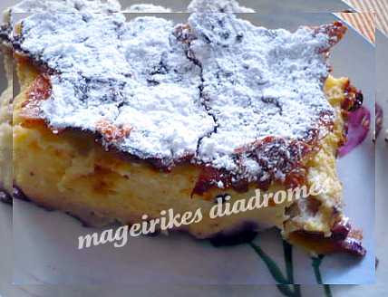 Προσθέτουμε τα φρούτα από πάνω και ψήνουμε σε ζεστό φούρνο στους 190 βαθμούς για 40 λεπτά .
