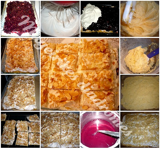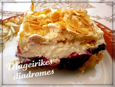 - Σε ταψι τής κουζίνας,βαζουμε μια λαδοκολα, απλωνουμε ομοιόμορφα επανω την ζυμη, (η ζύμη είναι πολύ κολλώδες και λίγο δύσκολο να απλωθει, αυτό δέν μάς πειράζει), απλώνουμε καί τη μαρέγκα. Πασπαλίζουμε με αμύγδαλα. Ψήνουμε Στο μεσαίο ράφι περίπου 30 λεπτά μέχρι να ροδίσουν. Μετά το ψήσιμο, αφήστε να κρυώσει.
