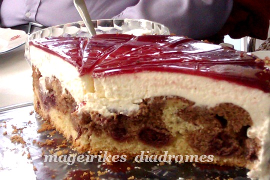 - Βουτυρωνουμε μια 24-26αρα φόρμα με στεφάνι. Πρώτα Στραγγίζουμε τα κεράσια και το χυμό τον κραταμε.