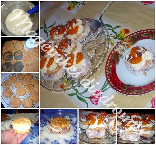 8.    Παίρνουμε μετα ενα κομμάτι απο το κομμενο παντεσπανι, βαζουμε επανω κρεμα και σκεπαζουμε με ενα αλλο κομματι παντεσπανι, το αλείφουμε γυρω γυρω με μαρμελαδα και  πασπαλιζουμε τά πλάγια καλά με την καρυδα