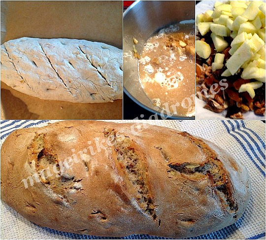 - Σε ενα κάδο του μιξερ βαζουμε το Αλεύρι, το λάδι, το αλάτι, τα μηλα τα αλεσμενα με την ανακατεμενη μαγιά, ζυμώνουμε όλα μαζί 3 λεπτά. Ανακατώστε στο τέλος τα κομμάτια μήλου, σταφίδες και ξηρούς καρπούς και ξανά ζυμώνουμε λίγο ακόμη να ενωθούν καλα, η ζύμη είναι ελαφρώς υγρη και λιγο κολλώδης, αν κολλάει πολύ, βαζουμε πολυ λιγο αλεύρι, σχεδόν 4 κ. σούπας αλευρι. Αυτή η ζύμη δεν είναι πολυ σφιχτή.