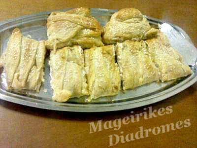 - Διπλώνουμε τις λωρίδες σταυρωτά-διαγωνίως, αλείφουμε με λάδι ή αυγό χτυπημένο, πασπαλίζουμε με σουσάμι και ψήνουμε στους 180ο για 30-35 λεπτά να ροδίσει.