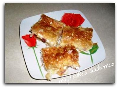 - Πασπαλίζουμε με τριμμένα τυριά και ζαμπόν και προσθέτουμε ακόμα ένα φύλλο διπλωμένο στη μέση.