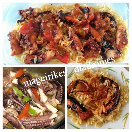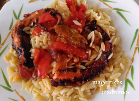 Χταπόδι με κριθαράκι φρέσκια ντομάτα και πιπεριά