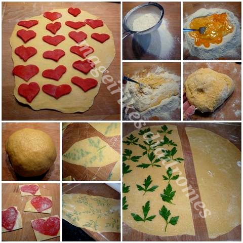 - Ανοιγουμε το κοκκινο κομματι ζυμη σε φυλλο με κουπ καρδουλας η οτι αλλο θελουμε , κοβουμε τα σχεδια.