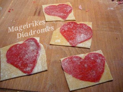 - Ανοίγουμε το 2ο κομματι ζυμη σε φύλλο 30χ30 και πάντα βάζουμε αρκετό αλεύρι να μην κολλάει. Βαζουμε επανω τις καρδουλες και ξαναπλαθουμε να ενωθουν καλα επανω στο φυλλο που ανοιξαμε. Κοβουμε σε κομματια ετσι που να φαινεται καλα το σχεδιο.